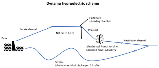 The hydroelectric power station (hydroelectric scheme, Figure 6) is equipped with two horizontal Francis turbines from Gugler, originally designed with a capacity split of around 2/3:1/3, amounting to 1.70 m3/s and 0.85 m3/s, respectively, resulting in a total equipped discharge capacity of around 2.55 m3/s. The minimum operating flow is set at 0.032 m3/s. The average net head of the Dynamo structure is 12.8 m. The river stretches between the dam and the restitution over a total length of 2.05 km.