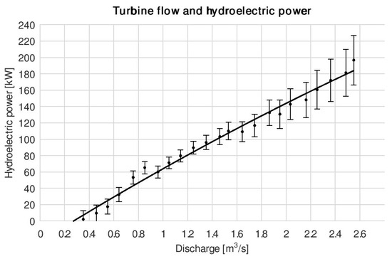 Relationship between the channel discharge and the Dynamo hydroelectric power generation. The points with the error bars represent the energy production values measured for a corresponding theoretical flow rate, which are deduced from the theoretical flow distribution arriving at the dam. The main line represents the regression curve of the mean values for each rounded discharge.