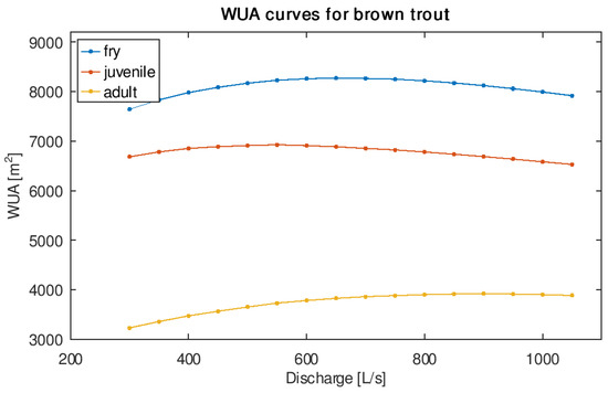 WUA curves for fry, juvenile, and adult brown trout. The minimum ecological flow is 400 L/s.