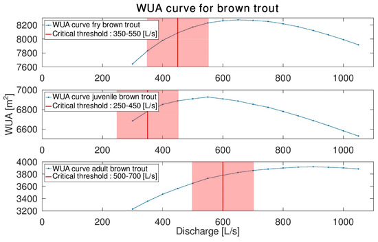 WUA curves and critical thresholds for fry, juvenile, and adult brown trout. The critical thresholds for these stages are 450 L/s, 350 L/s, and 600 L/s, respectively.