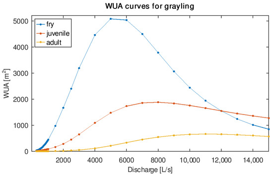 The WUA curves are also computed for grayling (Thymallus thymallus), keeping the same distinction into life stages (Figure 10). In these cases, the flow ranges from 300 L/s to 15,000 L/s. The maxima of these curves are located at a considerably higher flow rate than the ones for brown trout. The WUA curves for grayling follow an exponential progression for all three life stages between 300 and 3000 L/s. This suggests that this species would benefit from increased habitable surface area for increased flow between these values.