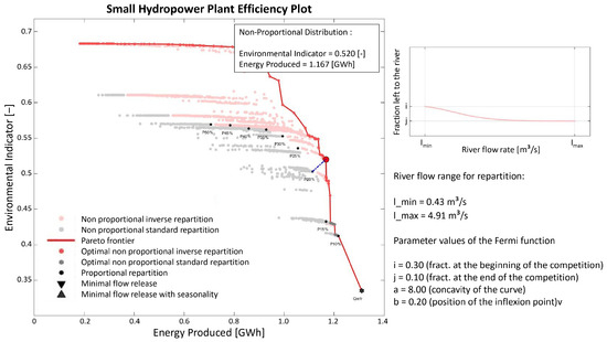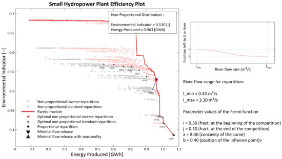 In Switzerland, the current practice involves maintaining a constant minimum residual flow seasonally or throughout the year. However, in the past decade, there has been research aimed at improving flow distribution by exploring a non-proportional allocation approach [8,9]. More recently, Razurel et al. (2016) [10] suggested a non-proportional flow distribution method based on the Fermi function. This approach offers operating conditions close to the Pareto frontier, improving ecological and economic aspects more effectively than traditional flow management policies. Furthermore, this approach has the potential to reconcile ecological imperatives with Switzerland’s 2050 energy strategy, thus mitigating the conflict between hydropower production and river ecology. Specifically, these studies have demonstrated that river ecology and hydroelectric production exhibit a non-linear relationship, indicating that even small changes in river discharge allocation can lead to significant improvements in environmental quality. This makes non-proportional distribution methods highly promising for future management practices.