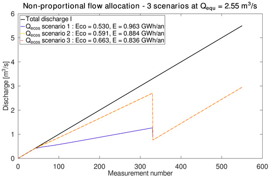 The traditional method of allocating a fixed ecological flow with or without considering seasonality is the most energetically efficient, but the least environmentally friendly. Proportional flow allocation improves environmental impact compared with the fixed ecological flow approach yet it results in a significant loss of hydroelectric production. Finally, non-proportional flow allocation is the best option for balancing environmental needs and hydropower production, as already proven in Razurel et al. (2016) [10]. As proportional flow allocation gives less promising results than non-proportional flow allocation, only non-proportional allocation proposals are considered for choosing scenarios (see Figure 11 and Figure 12).