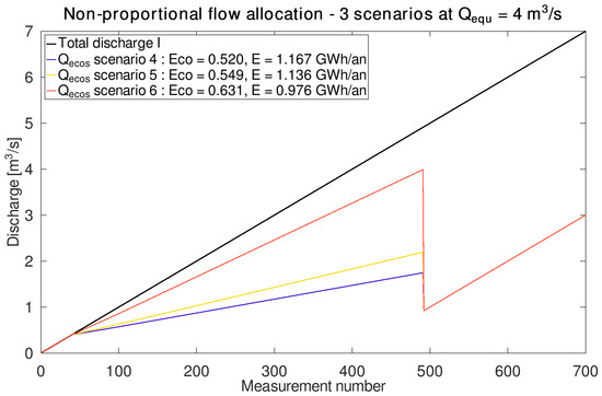The flow distributions of Scenarios 1–3 for an equipped flow of 2.55 m3/s are compared withgether (Figure 13), while Scenarios 4–6 are contrasted for an equipped flow of 4 m3/s (Figure 14). The curves obtained, constructed based on the specific parameters detailed in Table 2, exhibit a relatively linear behavior, with inflection points primarily occurring at low flows. Generally, an increase in the Eco environmental index corresponds to an increase in the flow released into the ecosystem. Scenarios 2 and 3 display similar flow values, and the only visible deviation occurs when the total flow I reaches values around 0.6 m3/s. The competition between the environmental and the economic index begins at I = 0.4 m3/s and ends when I = Imax, at the break in the curve. This break occurs at I = 3.3 m3/s for Qequipped = 2.55 m3/s (Figure 13), and at I = 4.91 m3/s for Qequipped = 4 m3/s (Figure 14).
