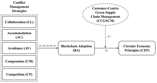 The Technology Acceptance Model (TAM) proposed by Davis [25] provides a framework for understanding how the usability and usefulness of technology impact customer adoption, with usability and perceived usefulness being key factors expected to influence the popularity of blockchain technology. Implementing conflict resolution strategies that address stakeholder concerns and emphasize the advantages of blockchain technology may enhance stakeholders’ perceptions of the technology, affecting their willingness to embrace it. Furthermore, regarding circular economy principles, stakeholder theory highlights the need to align business practices with the broader environmental and social goals valued by external stakeholders, including customers, community groups, and regulatory agencies [82]. Finally, in the context of CCGSCM, Chavez, Yu [69] employed this theory and noted that stakeholder theory highlights the role of customers as key stakeholders. Based on customers’ demand for environmentally sustainable products, SMEs adopt green practices in their supply chains. Cousins, Lawson [83] noted that this theory helps understand the role of customer preferences in driving supply chain management decisions. In this study, stakeholder theory was employed to explain the relationships and develop hypotheses. The relationships and hypotheses are presented in Figure 1.