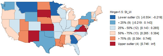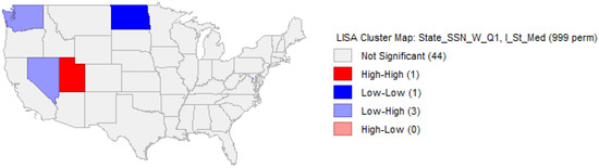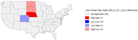 Unlike the conventional estimation of the distribution, the permutation of observed values across the locations simulates spatial randomness with artificial spatial randomization. A large number of permutations (i.e., R times) creates the reference distribution for testing the null hypothesis of spatial randomness. If the observed spatial distribution of the variable of interest falls within the rejection area (with less than 5% of pseudo p-value shown in Equation (3)), the pseudo p-value locates a relative position of the statistic relative to the reference distribution from permutation representing spatial randomness [16]. Since the reference distribution is formed using the artificial randomization with R number of permutations, the small number of observations (or 49 spatial units, i.e., lower 48 states and Washington, D.C.) does not impact the significance of testing methods used for spatial randomness. What matters for the significance testing is the number of permutations, R, and we randomized 9999 times to create a reference distribution for testing the spatial randomness of each responsiveness. More importantly, states, not local governments such as counties or municipalities, are responsible for implementing social welfare policies with various federal funding. Geographically heterogeneous policy implementations of social safety nets are mostly at the state level. Additionally, the purpose of this study is to analyze how states responded to the economic shock in the COVID-19 pandemic (measured by rising unemployment rates) with the utilization of the four different types of social safety nets. Instead of developing a time-series model, this approach fits better to explore how each state responded differently and if any distinctive spatial distribution patterns exist of the responsiveness (captured by the presence of spatial autocorrelation in contrast to spatial randomness).
