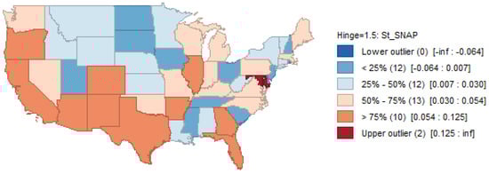 Next, the spatial patterns of the SNAP responsiveness index were examined. As Figure 3 suggests, numerous adjacent jurisdictions—particularly in the southwest—responded favorably to the economic downturn of the 2020 pandemic recession. The top-ranking SNAP-responsive jurisdictions were Maryland (0.179), Washington D.C. (0.133), California (0.118), New Mexico (0.117), Georgia (0.116), Arkansas (0.096), Florida (0.084), Arizona (0.079), and Oregon, (0.67).