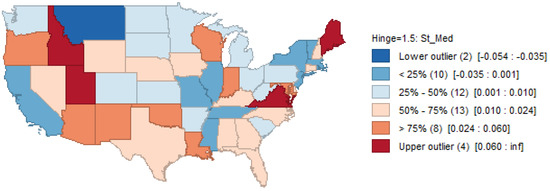 Conversely, the responsiveness score of North Dakota was 0.0088, lower than the national average in Medicaid, identified as a low-low cluster core state with its neighboring states’ average also lower than the national average. In contrast to all the states just mentioned, Nevada and Washington are the core states of the two low-high spatial outliers. Nevada is the core state of a low-high outlier with lower responsiveness. In contrast, the average of its five neighboring states (Arizona, California, Utah, Idaho, and Oregon) was higher than the national average. This also applies to Washington’s lower responsiveness than the national average with the higher average of its neighboring states.