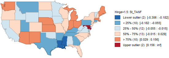 In the following sections, we present empirical findings from the global and local level tests for the presence of spatial autocorrelation (distinctive spatial patterns such as spatial clusters or spatial outliers). Previous studies utilized ESDA for the geographic distribution of social safety nets such as TANF, considering labor market performance [13] and the impact of TANF on child neglect. For more details about how ESDA tested the spatial distribution patterns, refer to the methodology section in these empirical studies [13].