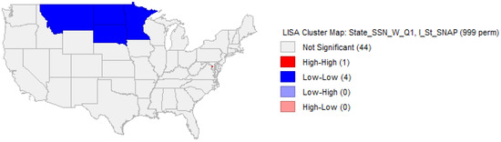 Figure 7 shows local spatial clusters of SNAP responsiveness to the pandemic recession. The averages of SNAP’s responsiveness rate of states surrounding the core states of Montana, North Dakota, South Dakota, and Minnesota were lower than the national average in SNAP responsiveness (0.0356%). These states formed a low-low cluster with lower responsiveness among these states compared to the national average responsiveness of 0.03456%.
