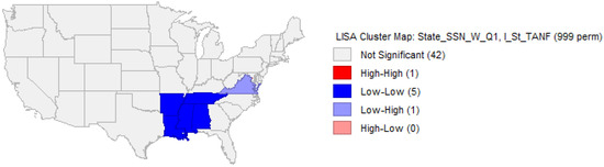 In Figure 9, the highlighted states are core states of statistically significant spatial clusters for responsiveness in TANF caseloads from the monthly pre-pandemic to the pandemic period. Figure 9 shows that several southern states, such as Louisiana, Arkansas, Mississippi, and Tennessee, form the low-low core states. Their responsiveness rate was lower than the national average TANF responsiveness rate (−0.00625), and their neighbors’ averages were also lower than the national average. Interestingly, in the cases of SNAP and TANF, we find low-low clusters that are statistically significant. In the case of SNAP, it is in the northern plain states, and in the case of TANF, it is in several southern states.