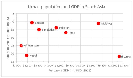 Share of urban population and per capita GDP in South Asia. Source: Plotted from data by ‘Our World in Data’ (https://ourworldindata.org/urbanization#how-urban-is-the-world, accessed on 27 October 2024) and ‘World Bank’ (https://data.worldbank.org/indicator/NY.GDP.PCAP.KD, accessed on 27 October 2024).