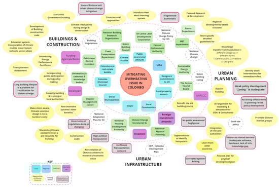 Figure 4 aims to capture the stakeholders that need to be involved (core—blue boxes and periphery—green boxes), identify agencies and individuals that could effect the necessary changes (purple boxes), and provide a set of exemplary policy prescriptions (yellow ovals). These are clustered around three scales of potential intervention—urban planning, infrastructure, and building scales. These scales are in line with the findings of [37,38]. The grey boxes present the many challenges and bottlenecks identified by our interviewees as major causes for urban climate inaction and by clustering actors and policies around the key challenges; we have attempted to identify specific pathways of implementation, key actions, and policies that are needed to enable these interventions and actors and agencies that should be tasked with the implementation. Further work is needed to flesh out specific implementation plans and feasibility analysis under different socio-political contexts. The examples provided in Figure 4 for the Colombo context, together with previous work by [37,38], could serve as a template for embedding urban climate knowledge in urban planning.