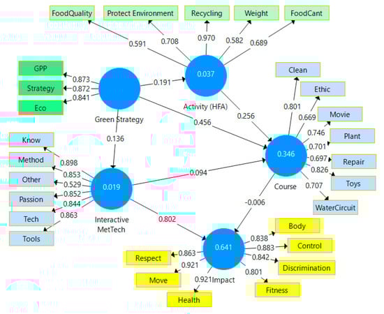 Cronbach’s alpha for the following variables: Activity, Green Strategy, Met_Tech, Impact, and Courses. Source: SmartPLS analysis (reprinted from a free version of SmartPLS software, version 3.3.9, created on 20 August 2024) [40].