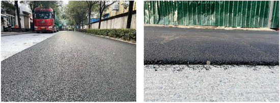 This study has investigated the primary data from a test section of a maintenance project in Jingyang Town, Fuqing City, Fujian Province. In the maintenance area, most of the driving vehicles are cars or small cargo vehicles, with a designed speed of 40 km/h, and the test section was paved with a self-healing, ultra-thin overlay with a thickness of 20 mm and a width of 9 m. Figure 1 shows the maintenance area of the self-healing, ultra-thin overlay. It is noted that the experimental results have already verified the practicability and self-healing performance of self-healing asphalt mixtures before paving the test section, whose induction heating rate could reach 3.0 °C/s, with a steel fiber content of 2.4% of mineral materials mass.