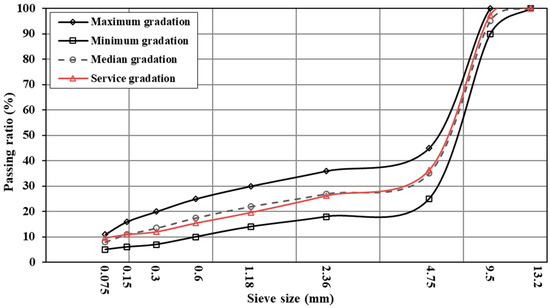 The fundamental properties of the materials used were measured according to the Chinese Standard of Test Regulations for Asphalt and Asphalt Mixtures in Highway Engineering (JTG E20-2011) [45]. Table 1 shows the fundamental properties of the SBS-modified asphalt binder, which was produced by Xiamen Huate Group Co., Ltd. (Xiamen, China). The basalt aggregate was provided by Fujian Zhangping Haoyuan Building Materials Co., Ltd. (Zhangping, China). Table 2 lists the basic properties for basalt aggregate. Meanwhile, a limestone powder provided by Fujian Sanyouxin Trading Co., Ltd. (Fuzhou, China) was used as the filler. To prepare the self-healing, ultra-thin overlay, this study used steel fiber as the conductive material for the self-healing induction due to its superior electromagnetic properties and durability in asphalt mixtures. The used steel fiber was provided by Jiangsu Jinjuoju Metal Products Co., Ltd. (Nantong, China) and had an average length of 4.2 mm; the equivalent diameters ranged from 70 to 130 um. The addition content of the steel fiber was 2.4% of mineral materials mass. Table 3 shows the fundamental mechanical properties of steel fiber. Figure 2 depicts the gradation curves for self-healing, ultra-thin asphalt overlay. According to the production proportions, the asphalt content for the asphalt mixture was 5.70% and the maximum theoretical density was 2.667 g/cm3.
