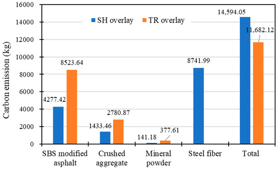 Figure 4 shows the carbon emissions of SH overlay and TR overlay during the material extraction phase. Although the materials required for the SH overlay were only half that of the TR overlay, the overall emissions from the material extraction phase was still higher than that of the TR overlay. The material production and transport of SH overlay caused 14,594.05 kg of equivalent CO2, and the emissions by the TR overlay reached 11,682.12 kg of equivalent CO2. According to the analysis of the emissions from different materials, the steel fiber generated the most carbon emissions, with 8741.99 kg of equivalent CO2, although it had the lowest dosage (mass proportion of 2.21% in the asphalt mixture). The carbon emissions generated by SBS-modified asphalt also occupied a greater percentage. Specifically, the SBS-modified asphalt in SH overlay and TR overlay resulted in 4277.42 kg and 8523.64 kg of equivalent CO2, respectively. Meanwhile, the emissions from crushed aggregate achieved 1433.46 kg and 2780.87 kg in the SH overlay and TR overlay, respectively. Additionally, acquiring the mineral powder released the least carbon emissions, with 141.18 kg for the SH overlay and 377.61 kg for the TR overlay.