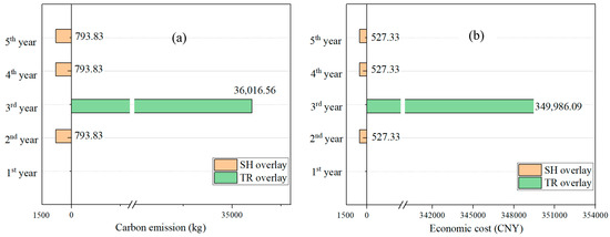 (a) Carbon emissions and (b) economic costs for the later maintenance phase.