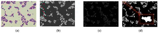 Stages of the processing of a microscopic image of Micrococcus spp. morphotypes, starting with the original image in (a), converted to grey-scale and reversed to the image in (b), on which top-hat transform was applied to produce the version shown in (c), which was binarized to create (d). Blobs, shown in white in the binarized version in (d) are isolated and measured individually as illustrated by the example shown in the red rectangle.