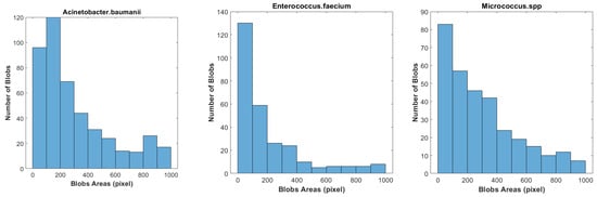 Histograms of the areas of blobs in microscopic images of different bacteria as per the title on the top of each graph, where the y-axis represents the number of blobs in each area range on the horizontal axis.
