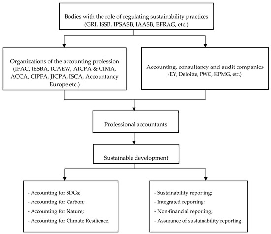 Professional accountants play a crucial role in promoting sustainable development by assisting companies in making “informed decisions that balance social, economic, and environmental concerns, allowing them to run more sustainably” [7] (p. 760). According to [1], corporate responsibility, especially corporate accounting, reporting, and assurance activities, should not only focus on financial performance but also sustainability issues, and [8] believes that the accounting profession should take greater responsibility in the sustainability debate.