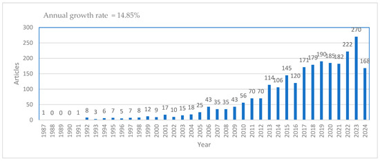 Analyzing the annual scientific production, we can observe an obvious trend of increasing interest in research on the relationships between APASI, an interest expressed by the increasing number of publications published each year. In the period of 1987–2005, we observed a relatively modest number of documents published in the field of research that is the subject of our study, while starting with 2005, there was an almost constant increase in the interest shown by researchers in this topic. Figure 3 shows that the years with the most prolific scientific production are 2022, with 222 published documents, and 2023, with 270 publications, while 168 documents were published by mid-2024.