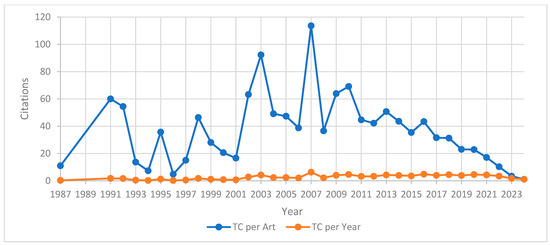 Another element of analysis that can be correlated with the annual scientific production refers to the average number of citations, which concerns two aspects: on the one hand, the average number of citations per article, and on the other hand, the average number of citations per year. If in the case of average citations per year a relative constancy can be observed, in the case of average citations per article, we observe a more pronounced variability. For the calculation of these indicators, the facilities offered by the Bibliometrix application were used, as shown in Table 3, and the graphical representation of the evolution of the average number of citations can be found in Figure 4.