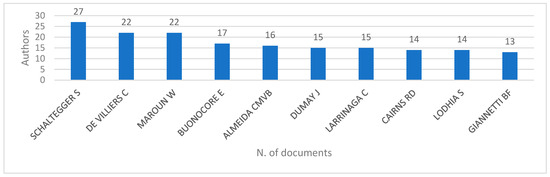 Our research also revealed a ranking of the most productive authors who were concerned with the research activity of the relationships between APASI. For the 37 years under analysis, Figure 7 places Schaltegger S. at the top of the podium of this ranking with 27 articles, followed by Villiers C. and Maroun W. with 22 articles each, and Buonocore E. in the third position with 17 articles.