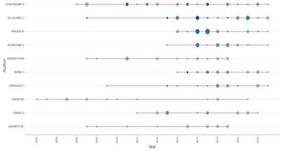 In general, we can see from Figure 8, which shows the scientific production of the most relevant authors over time, that the most prolific time interval is between 2015 and 2023, which corresponds to the general trend in terms of interest in this field. The size of each circle represents the number of articles published annually, while the color intensity indicates the total number of citations per year.