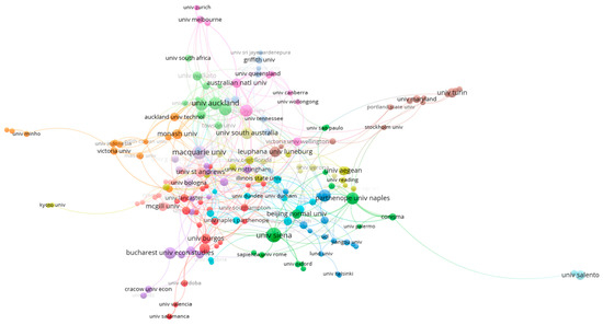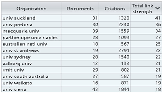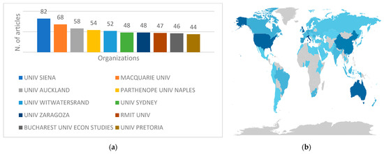 The academic institutions that, through their affiliated authors, had the most concern in the field of research that is the subject of our study, are shown in Figure 9a. In first place, we find the University of Siena in Italy, whose researchers produced 82 articles in the 37-year period under analysis, followed in the top 3 by Macquarie University in Australia, with 68 articles, and the University of Auckland in New Zealand, with 58 articles. Other academic institutions included in this ranking whose researchers were involved in the study of the relationships between APASI are Parthenope University of Naples in Italy, University of the Witwatersrand in South Africa, University of Sydney in Australia, University of Zaragoza in Spain, and Academy of Economic Studies in Romania.