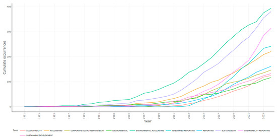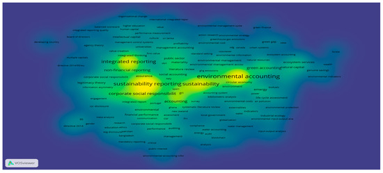 Likewise, the overall analysis of the most used keywords highlights both the complexity of the topic addressed by our study and the fact that there are direct and very nuanced relationships between accounting and the various facets of sustainability issues, such as environmental accounting, sustainability reporting, integrated reporting, issues regarding corporate social responsibility, sustainable development, corporate governance, sustainability stakeholders, etc. Figure 5 shows the keywords most used by the authors: “environmental accounting” (10%), “sustainability” (9%), “sustainability reporting” (8%), “integrated reporting” (6%), “accounting” (5%), “reporting” (4%), “corporate social responsibility” (4%), “sustainable development” (3%), etc.