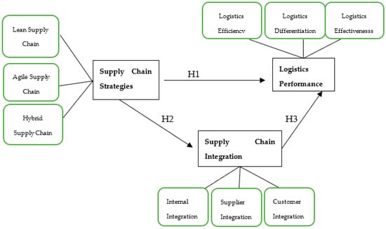 This research focuses on the relationship between dependent and independent variables and the role of mediating variables in this relationship. As a result of prior research, it was determined that the commonly used supply chain strategies consist of lean, agile and hybrid strategies, and supply chain integration consists of internal integration, supplier integration, and customer integration. In the measurement of logistics performance, it was concluded that logistics efficiency, logistics differentiation, and logistics effectiveness are commonly used and divided into three sub-dimensions. In addition, Fugate et al. (2010) determined that logistics performance can be measured by logistics efficiency, logistics differentiation, and logistics effectiveness, which influenced the choice of these criteria in this research []. Therefore, the model was created from these variables and sub-dimensions.