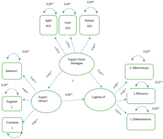 For the reliability test, internal consistency analysis, which is the method commonly used in the literature, was used and evaluated by calculating Cronbach’s alpha coefficient (α) []. This coefficient reveals whether the items in the scale express the whole or not, and it is required to be at least 0.7 []. In this study, the total reliability of the supply chain strategy scale was 0.940, the total reliability of the logistics performance scale was 0.937, and the total reliability of the supply chain integration scale was 0.925. Therefore, all scales were found to have perfect reliability.