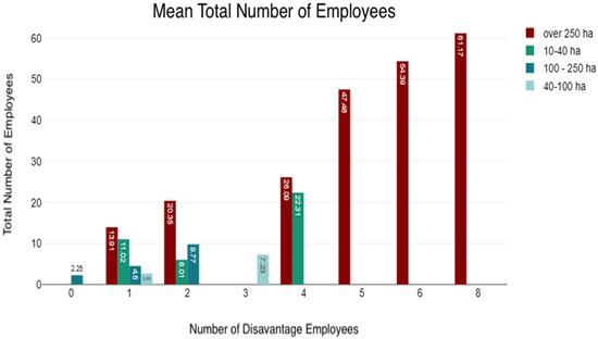 Farms with 100–250 hectares followed a similar pattern, but there was a noticeable increase in the number of total employees when there were up to two disadvantaged employees. However, the tendency ceases beyond this threshold, suggesting more distributed operational capacity and employment of disadvantaged people. This could be attributed to poor resources and organizational capacity, which prevents the effective inclusion of disadvantaged persons.
