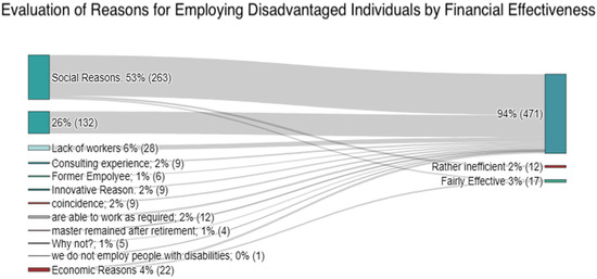 Economic reasons (4%; 22 employees): This category suggests that organizations view the employment of disadvantaged individuals as financially beneficial, potentially leading to higher productivity, reduced turnover costs, or access to government incentives. In this category, nine employees were considered rather ineffective, and nine were deemed somewhat effective.