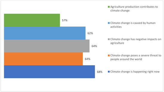 Overall, the CCP for the farmers in the sample ranges from 1 to 5, with a mean of 4.75 and a standard deviation (SD) of 2.03. The results imply that farmers have perceived climate change but have different agreement levels on various facets of CCP regarding existence, causes, and consequences. Distributions of the participants’ perceptions of climate change represented in five statements are shown in Figure 2. About 68% of the sample somewhat or strongly agreed with the presence of climate change. This result is comparable to the finding of a recent survey conducted by the Yale Program on Climate Change Communication (68% of adults confirm global warming in Missouri) [66], but higher than the result (57% of Midwest crop farmers) in Mase et al. [24]. For the causes of climate change, 61% admitted that human activities caused climate change, which is comparable to Campbell et al. [67], which found that 62% of ranchers in the southern plains had the same belief. However, only 41% of producers agreed that agricultural production contributed to climate change. About 64% were concerned about the possible negative impacts of climate change on agriculture, which is much higher than the results of Mase et al. [24] as only 16% of farmers agreed that climate change was hurting their farms, and 21% agreed that climate change might hurt their farms in the future.