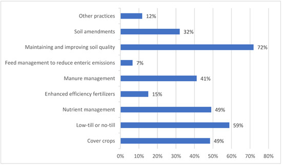 About 82% of the sampled farmers have adopted at least one CSP. Figure 3 shows popular practices adopted by producers, including maintaining and improving soil quality (adopted by 72% of adopters), low till or no-till (59%), cover crop (49%), nutrient management (49%), manure management (41%), soil amendments (32%). Some less popular practices are enhanced efficiency fertilizers (15%), feed management (7%), etc. About 15% of the respondents have not applied any climate-smart practices, and 3% are not interested in these solutions.