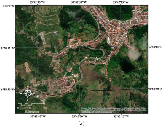 To analyze the studied areas, their proximity to the urban center of the municipality was observed, where the occurrence of mass movements would cause risks to the safety of people and property. Ref. [19] defines risk as the relationship between the probability of an instability phenomenon occurring and the magnitude of social and/or economic damage to a given group or community.