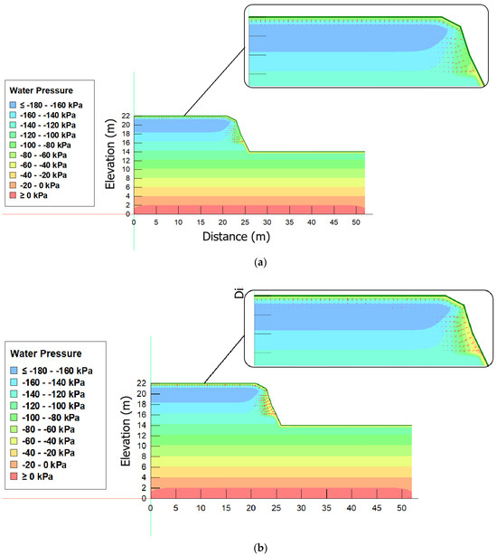 Figure 10 shows a summary of the infiltration modeling results with moisture conditions preceding the rain event on the fifth day after rain events lasting 24 h (Figure 10a) and 72 h (Figure 10b), respectively, for slopes MM and JL. The behavior of rainwater infiltration was similar for the different intensities of 8 mm/h, 4 mm/h, and 2 mm/h. The flow vectors were perpendicular to the pore pressure contours with a greater tendency towards vertical flow. Similar to the results obtained without antecedent precipitation, the vectors resulting from the various rainfall intensities are of an analogous nature, indicating that the rainfall intensity does not have a significant influence on the flow of water through the slope pores. The duration of the rainfall event also did not have a significant influence on the pore pressure.