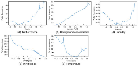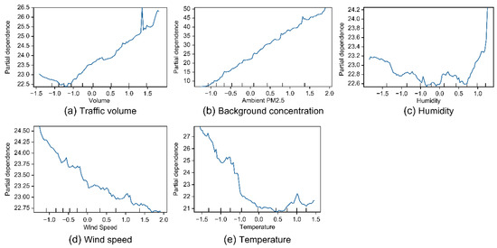 The PDPs reveal that the traffic volume and background concentration are positively correlated with PM2.5 (upward-sloping graph), whereas the temperature and wind speed are negatively correlated (downward-sloping graph). Humidity shows a weak positive correlation. These findings are consistent with the literature review (Table 2).