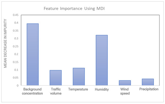 Previous studies focused on identifying the correlations among variables (e.g., analysis of positive or negative correlations between PM concentrations and explanatory variables). This study contributes a theoretical basis for identifying the relative importance of various explanatory variables. An examination of the importance of variables in the PM2.5 concentration estimation models revealed that the background concentration had the highest MDI value (0.67). Thus, this variable exhibited the strongest predictive power, followed by humidity (0.124), traffic volume (0.097), and temperature (0.087).