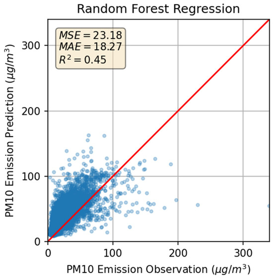 The PM10 concentration estimation models were analyzed using scatter plots, which revealed that the random forest model had the best predictive performance (Figure 5).
