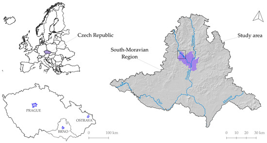 Situation map: position of the Czech Republic within Europe and position of the study area within the South Moravian region, data source: [55,56].