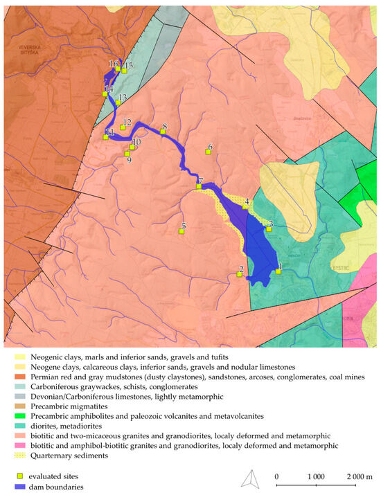 Geomorphologically, the Svratka River creates an incised, breakthrough valley with several levels of terraces. The bottom of the valley is narrow; only in the area of the extinct Kníničky village, it is several tens of meters wide, it floods regularly and is used for agriculture and pasture. Other important landforms are represented by valleys of tributaries of the Svratka River that are structurally controlled as they often follow the fissures and faults. The most important tributary is the Veverka River, which creates incised meanders before entering the Svratka River. Another tributary, Rozdrojovice stream, enters the Svratka River in a small bay near Sokolské koupaliště where granodiorite outcrops can be seen. Other specific landforms are represented by debris accumulations, formed by disintegration of the rocks of the Brno massif, which significantly influence the vegetation (occurrence of debris forests). Anthropogenic landforms are also present, the most remarkable is the reservoir (dam) itself, and then several settlement, agriculture, and communication landforms related to the recreational and tourist use of the area [60,61].