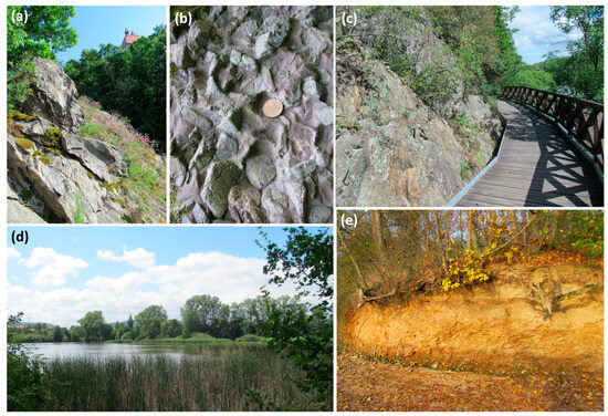 Selected sites with Earth science interest: (a) Veveří—outcrop of granodiorites, with a specific vegetation and high cultural relevance (Veveří castle); (b) a detail of conglomerates of Rokytná beds at the Břenčák Nature Reserve; (c) Kůlny Nature Monument with granodiorite outcrops—highly frequented tourist path; (d) Wetlands near Veverská Bítýška are situated just on the border of the Boskovice furrow; (e) Osada Abrasion Cliffs with sequences of sands and gravels. Photo: the authors.