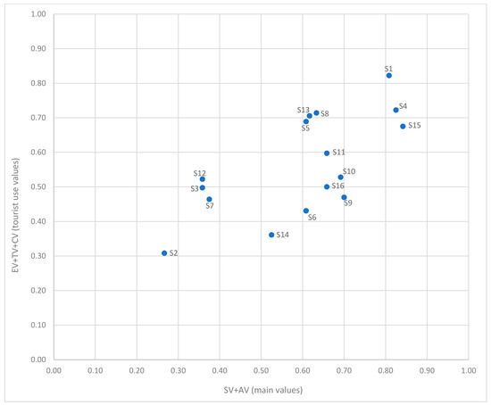 The relationship between main values (scientific and added values) and use values (educational, tourist and conservation values) of particular sites.