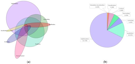 As part of the data-gathering process, and to obtain insightful information, the identified literature was categorized into seven groups based on the primary tasks of ML: prediction, forecasting, classification, screening, optimization, process control, and simulation acceleration. In addition to the frequent interchangeable use of some of these terms—such as prediction and forecasting—in the literature, overlaps exist among them due to the dynamic and innovative nature of ML methods and their diverse applications. An analysis of the frequency of different ML tasks in the PtX field, along with the overlaps, provides valuable insights (see the Venn diagram in Figure 3a). However, in a number of 61 articles from this collection (mostly review papers), no specific ML-based task or method was mentioned in the title, abstract, and keywords area; therefore, they were not categorized under any of these classes.