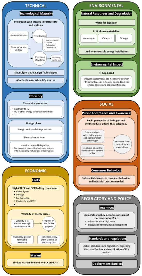 Infrastructural challenges, including geographical variability and the scalability of PtX projects, complicate the large-scale deployment of these technologies. Furthermore, implementing PtX processes in remote locations with high renewable energy potential but limited infrastructure adds to the operational challenges, leading to increased costs and complexity [34]. The transition to decentralized energy systems introduces additional complexities in ensuring stability and security, which are critical for the sustainable operation of PtX technologies [11,27].
