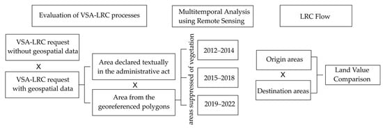 The methodology unfolds through the following steps (Figure 1): (a) acquisition of images from orbital satellites (Landsat 5, Landsat 8, Sentinel 2, and Planet) and the primary vector datasets; (b) evaluation of VSA-LRC processes with and without geospatial data and, for those with geospatial data, identification of discrepancies between the area declared textually in the administrative act and the area extracted by the georeferenced polygons; (c) multitemporal analysis using remote sensing techniques areas of alleged illegal VSA-LRC areas in the period 2012–2022; and (d) assessment of the regions of the state of Tocantins with the greatest allocation for LRCs across the eight municipalities analyzed.