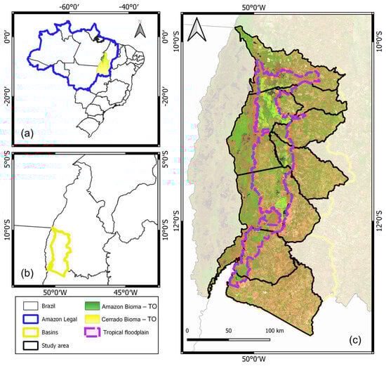 Location of the study area: (a) position within Brazilian territory; (b) in the State of Tocantins, covering the basins of the Formoso, Pium, and Javaés rivers; and (c) details of the study area, including the eight municipalities and with the positioning of the floodplain area.